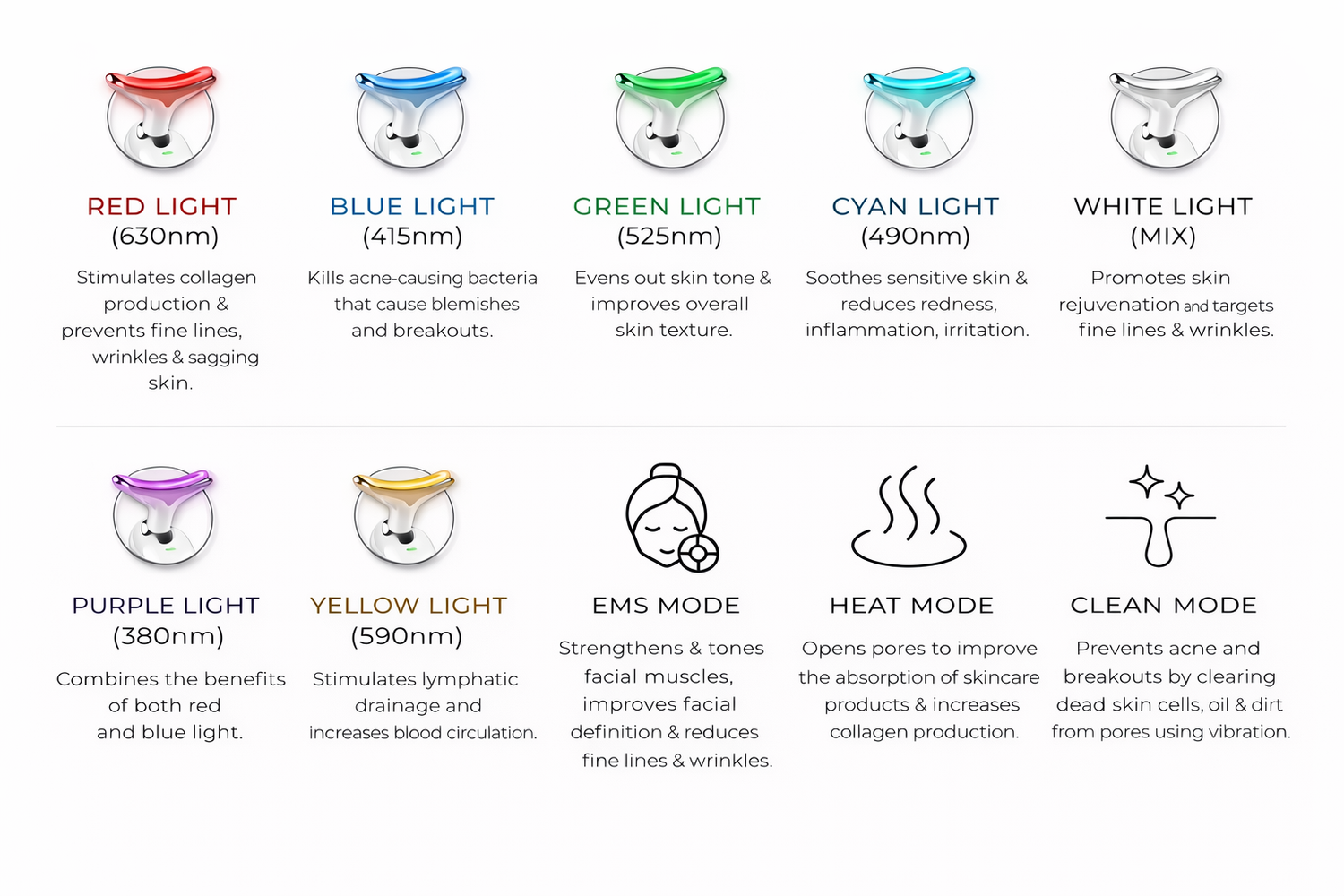 The red light mode works with EMS technology to support collagen production below the skin’s surface. This helps reduce fine lines, improve skin firmness, and boost elasticity, leaving the skin smoother and more youthful with continued use.